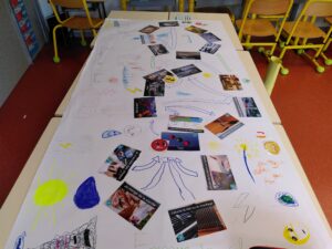 Les élèves ont ainsi pu réfléchir sur les notions suivantes : les gazs à effet de serre, les énergies fossiles, les puits de carbone, l’effet de serre, la canicule, la fonte des glacier, les submersions, les crus, le dérèglement du cycle de l’eau, les cyclones, la famine, la biodiversité terrestre et marine, …