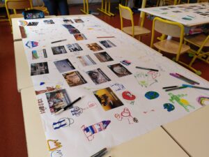 Après une courte pause récréative, les élèves ont investi leur fresque en les présentant à leur camarade. Expliquer le changement climatique grâce aux cartes avec de simples mots, voilà une belle manière de restituer les connaissances acquises lors de l’atelier.